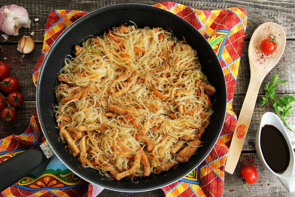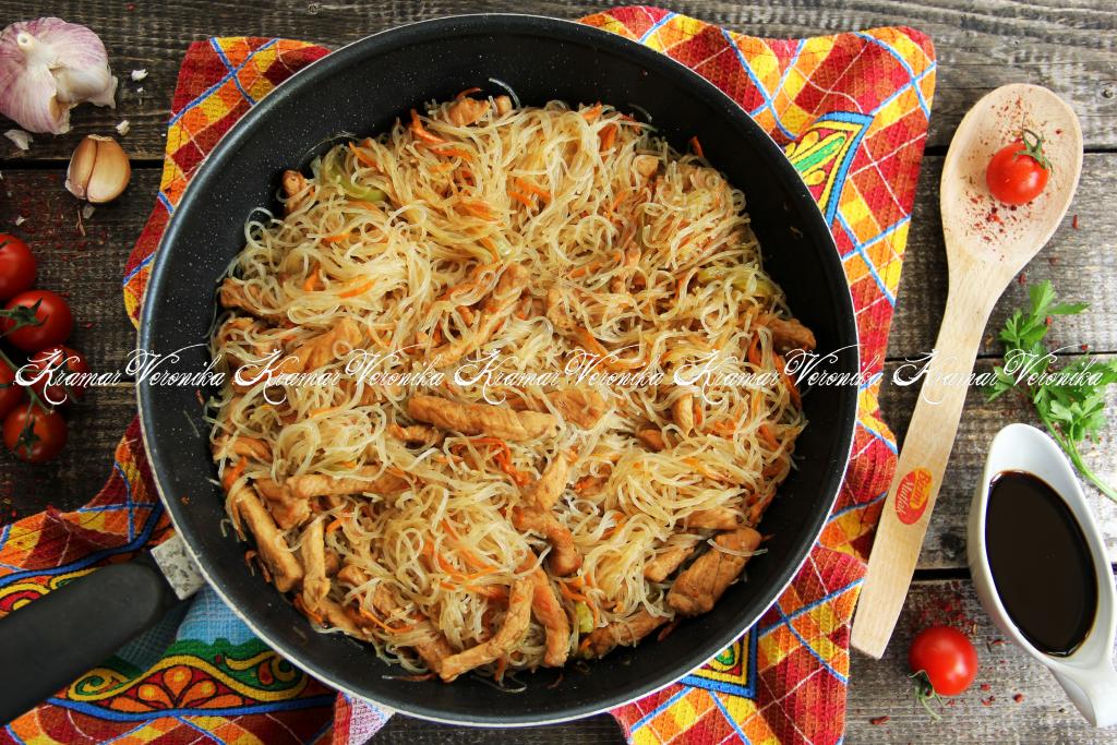 Фунчозу можно купить практически в любом супермаркете. Блюд из этой лапши существует немало. Предлагаю к семейному ужину или обеду приготовить фунчозу в сочетании со свининой и овощами в соевом соусе на сковороде. Это простое блюдо получается аппетитным, очень вкусным, сытным, к тому же готовится достаточно быстро.