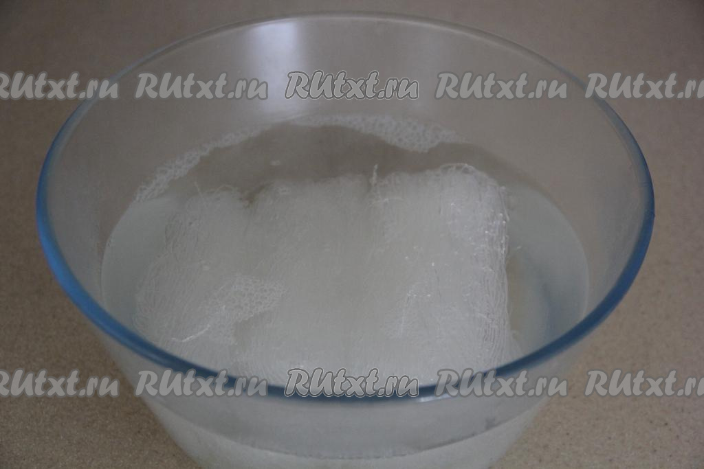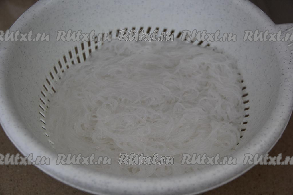 Взять дуршлаг, переложить в него фунчозу и хорошо промыть её холодной водой, оставить на несколько минут, чтобы стекла вода. Затем разрезать фунчозу ножницами на части.
