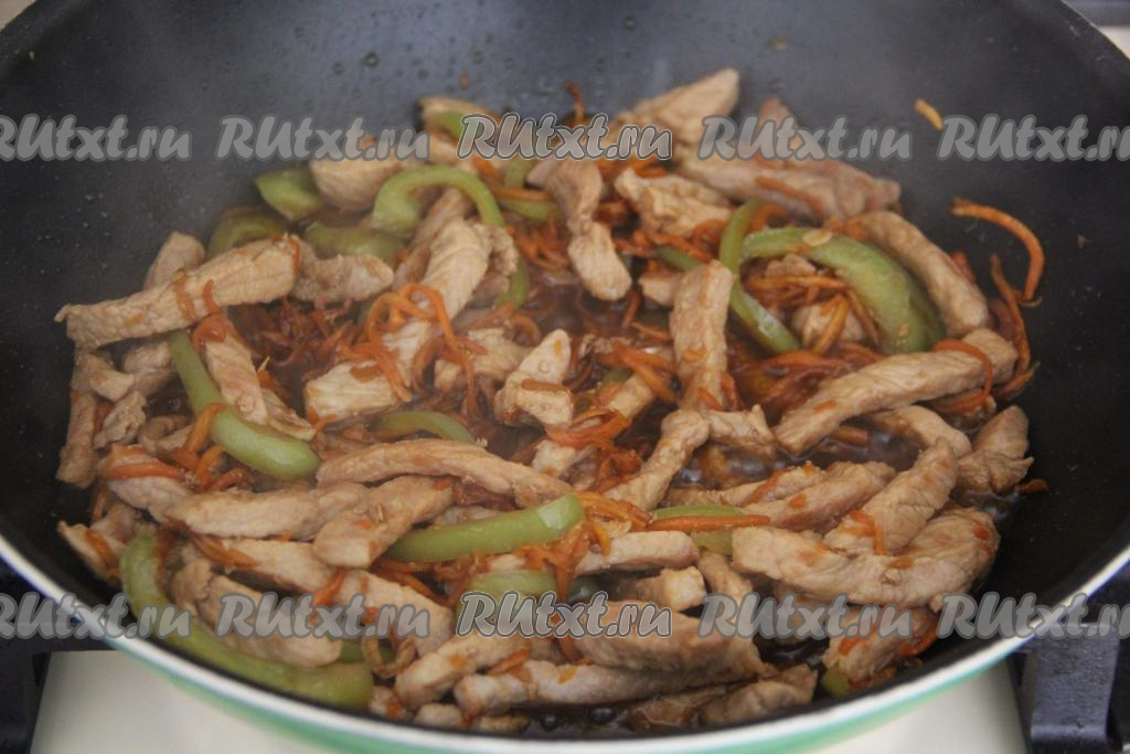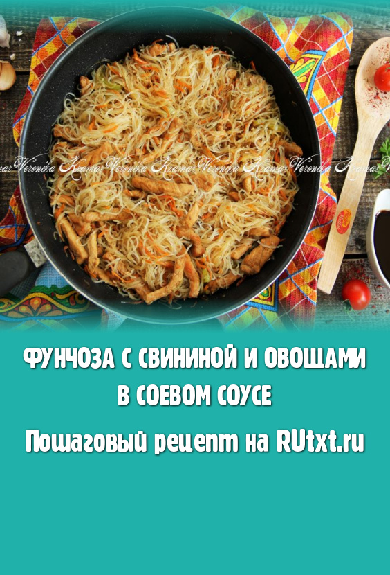 Фунчозу прогреть со свининой и овощами в соевом соусе минут 5, иногда перемешивая, снять с огня и сразу подать к столу. Очень вкусно!