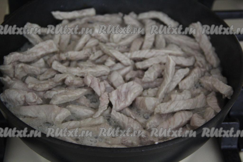 Свинину нарезать на длинные брусочки. Разогреть в сковороде растительное масло, затем выложить брусочки мяса в один слой, жарить на среднем огне.