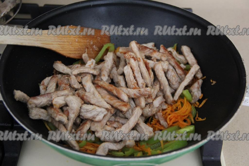 Добавить в сковороду с овощами обжаренную свинину, перемешать.