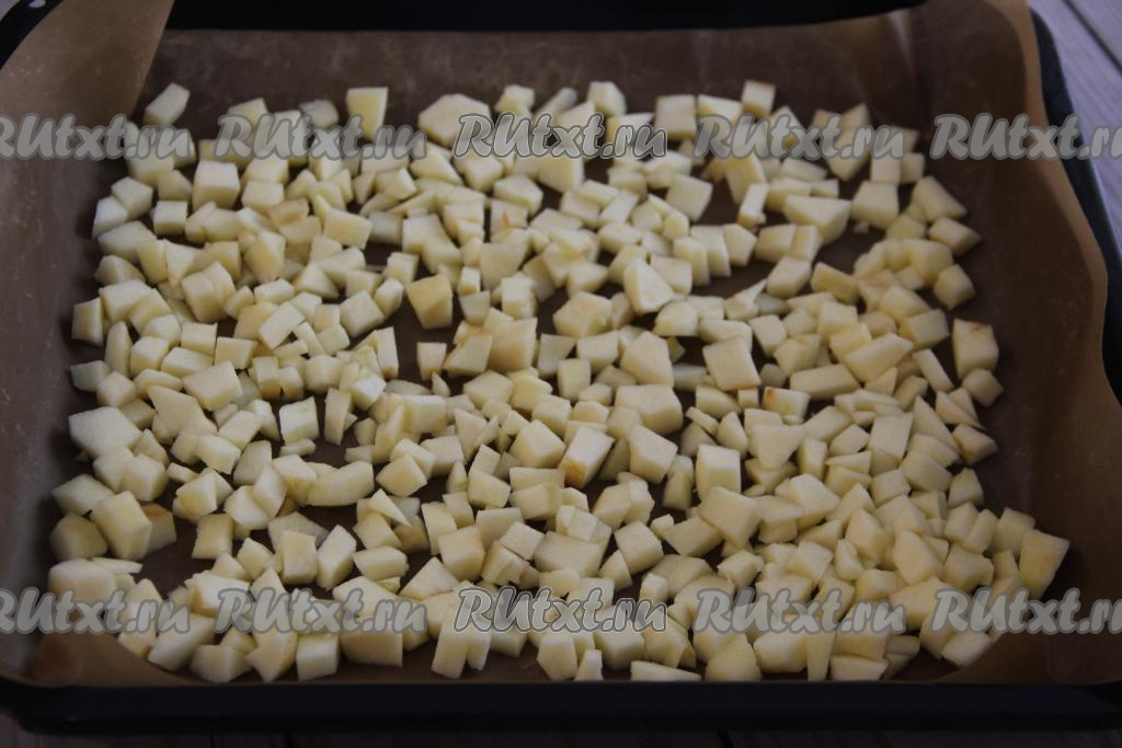 Противень (у меня противень размером 30 сантиметров на 30 сантиметров) застелить тефлоновым ковриком (или пергаментной бумагой). Яблоки почистить от кожуры и семечек, затем нарезать на мелкие кубики и выложить ровным слоем на застеленный противень.