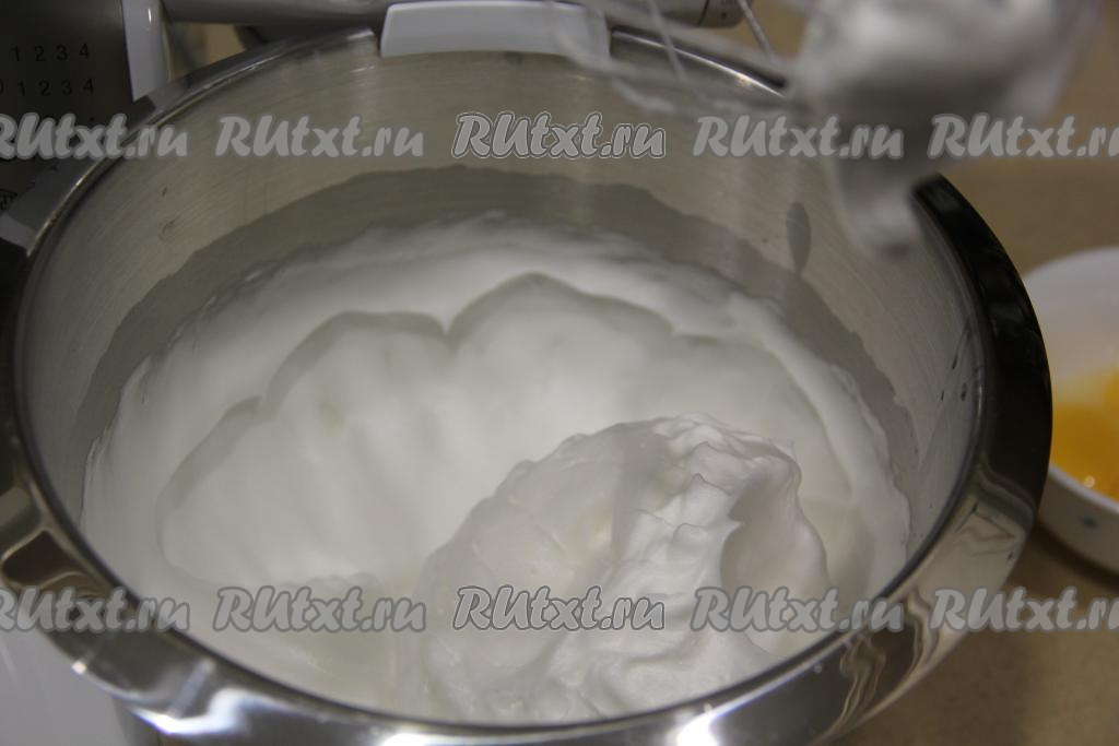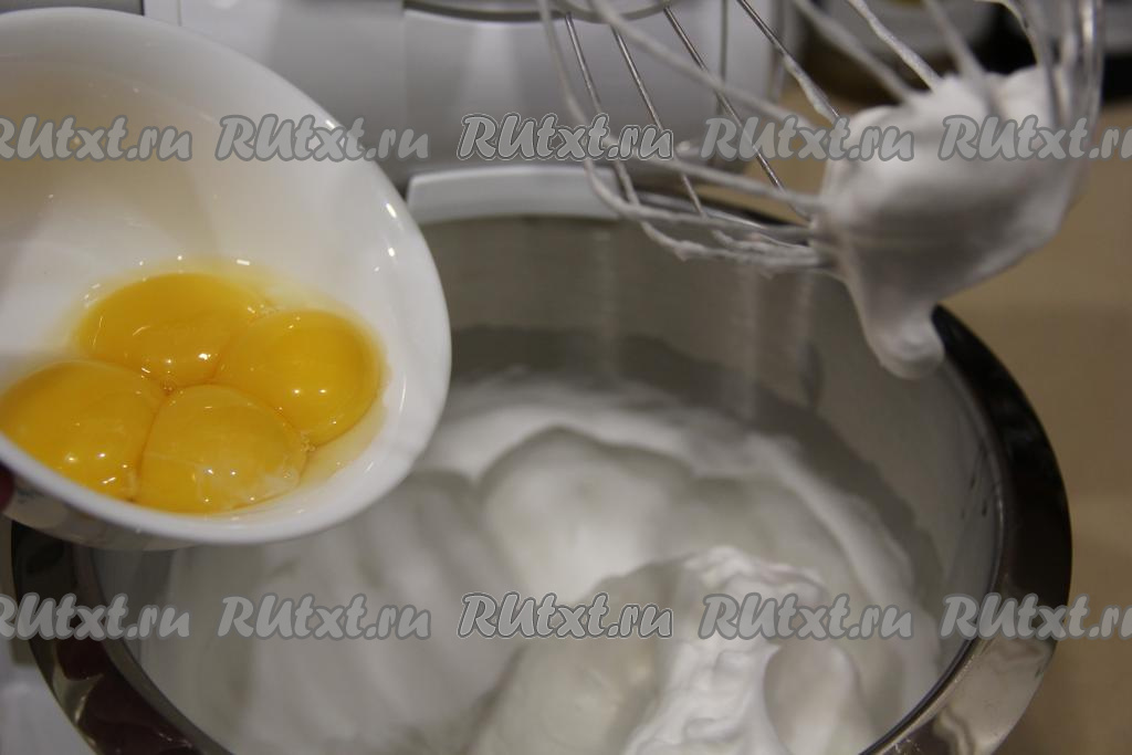 К взбитым белкам по одному добавить желтки, каждый раз хорошо вмешивая желток в белки на средней скорости миксера.