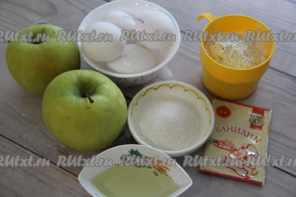 Выпекать бисквит с яблоками в разогретой духовке минут 15 (до лёгкого золотистого цвета) при температуре 180 градусов.