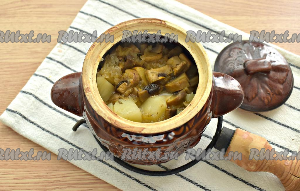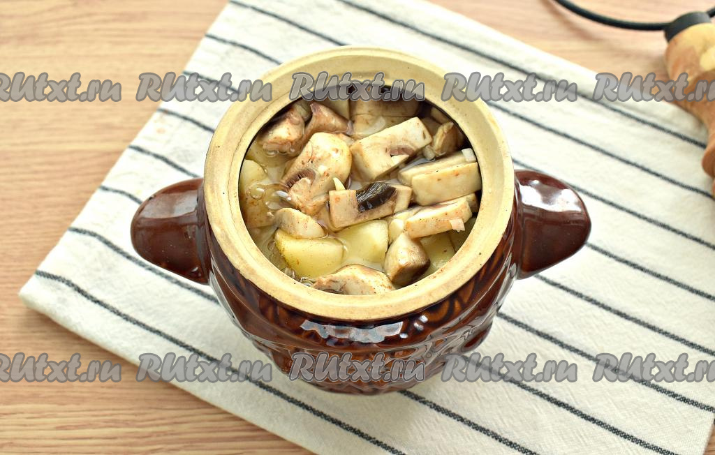Лучше поставить горшочек на противень, ведь вода будет кипеть и может выплеснуться из горшочка в процессе тушения. Горшочек с картошкой и шампиньонами накрываем крышкой и ставим в разогретую до 200 градусов духовку на 1 час.