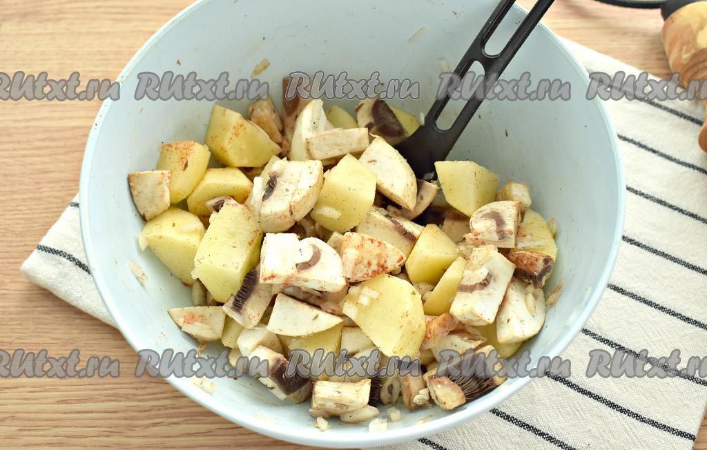 Шампиньоны, картофель и лук солим, перчим, посыпаем молотой паприкой.