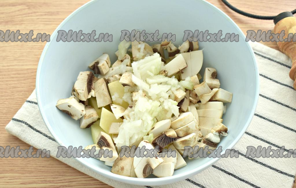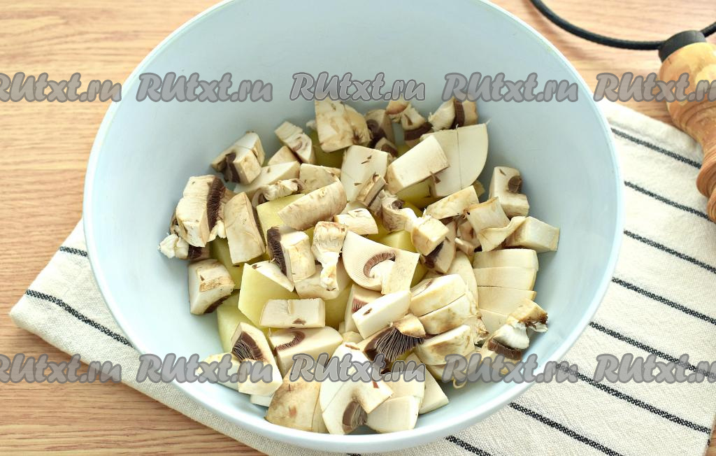 Шампиньоны вместе с ножками нарезаем на средние кусочки, добавляем в миску с картошкой.