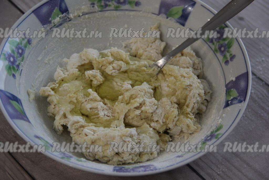 Перемешать тесто ложкой, оно будет комковатым. Влить оливковое масло.