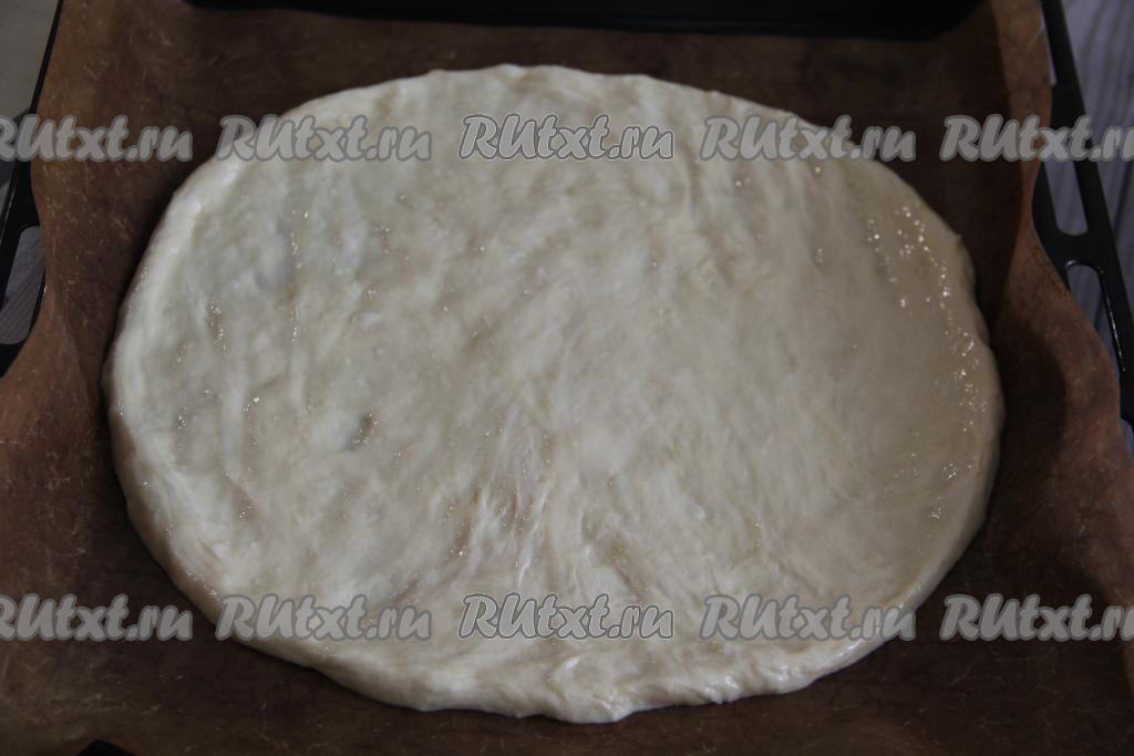 Противень застелить пергаментной бумагой (или ковриком для выпечки), Выложить тесто и руками, смазанными маслом, растянуть тесто в круглую основу диаметром 28 сантиметров.