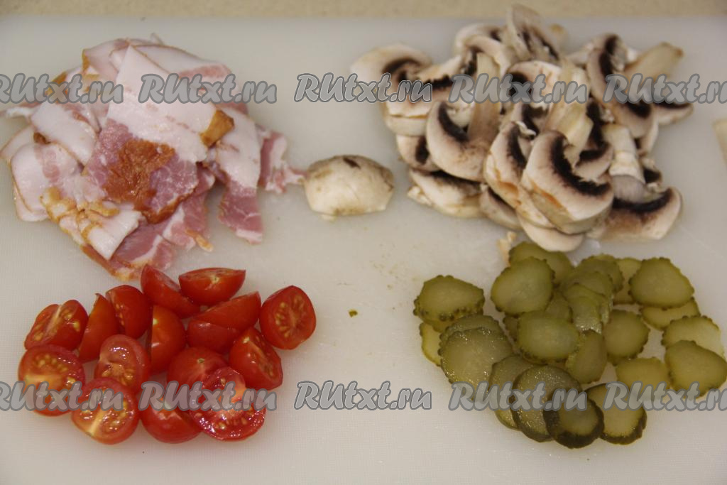 Пока тесто для пиццы отдыхает, можно подготовить начинку. Шампиньоны промыть, убирая загрязнения, немного обсушить и нарезать грибы на пластинки. Огурчик нарезать на кружочки. Помидоры черри разрезать пополам (если вы готовите с обычными помидорами, тогда нарежьте их на кружочки). Бекон нарезать на тонкие ломтики.