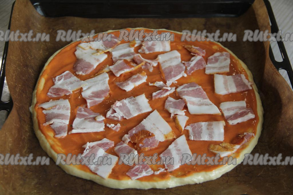 Отдельно смешать майонез и кетчуп, получившейся смесью смазать основу для пиццы. На смазанную основу для пиццы выложить сперва бекон.