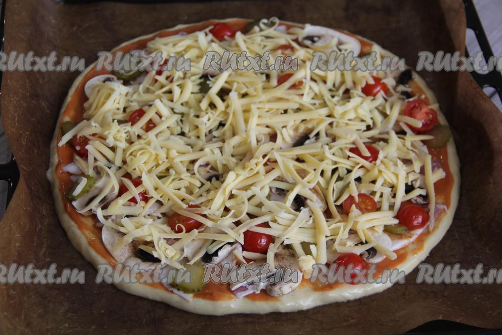 Посыпать сверху натёртым сыром и поставить в разогретую духовку. Выпекать пиццу с беконом и грибами минут 15 при температуре 200 градусов.