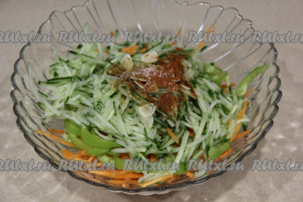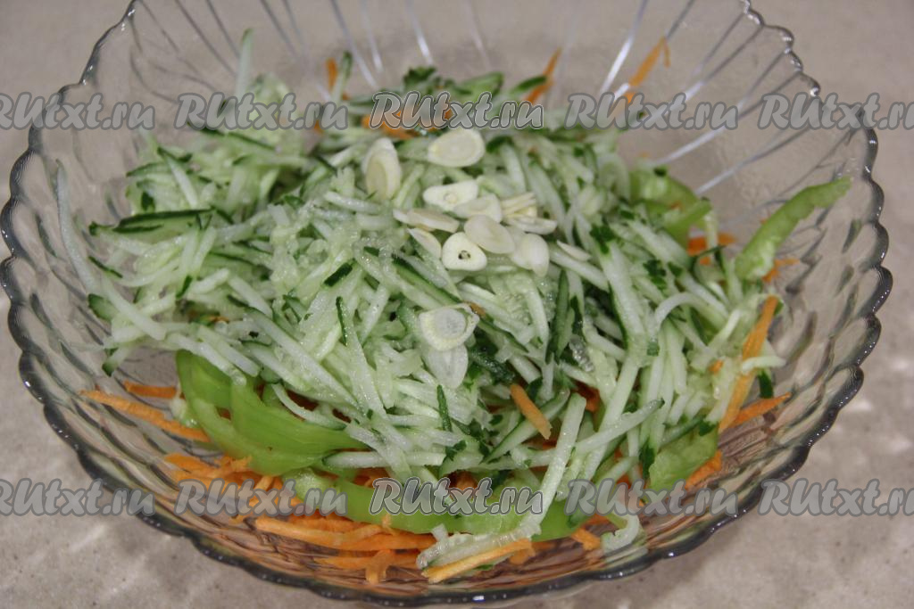 Чеснок почистить и нарезать на тонкие лепестки. В салатнике соединить морковь, огурец, болгарский перец и чеснок.
