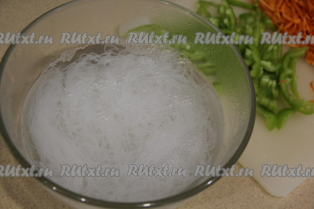 В объёмную миску выложить фунчозу, залить её кипящей водой (лапша должна быть полностью покрыта водой) и оставить минут на 5.