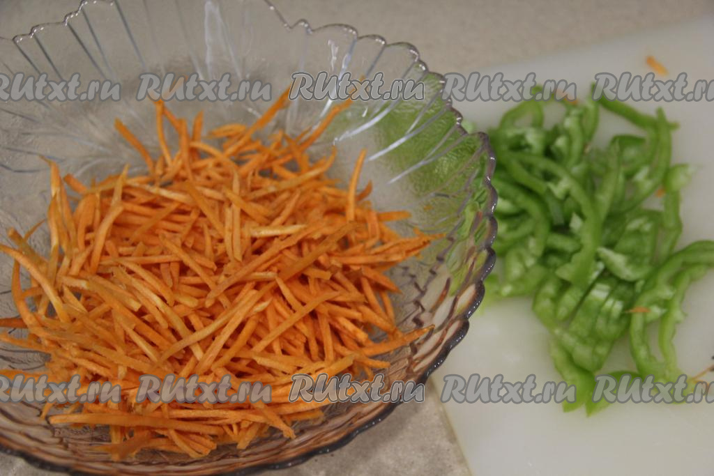 Болгарский перец вымыть, очистить его от семечек и нарезать на длинные полоски. Огурец вымыть. Морковь почистить. Натереть морковь и огурец на тёрке для корейской моркови (или нарезать на длинные брусочками).