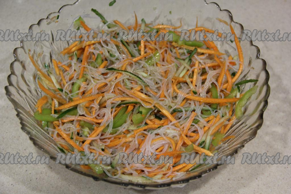По истечении 5 минут фунчозу откинуть на дуршлаг, затем её нужно промыть холодной водой и оставить на несколько минут в дуршлаге, чтобы стекла лишняя жидкость. Нарезать фунчозу ножницами и выложить в салатник с овощами.