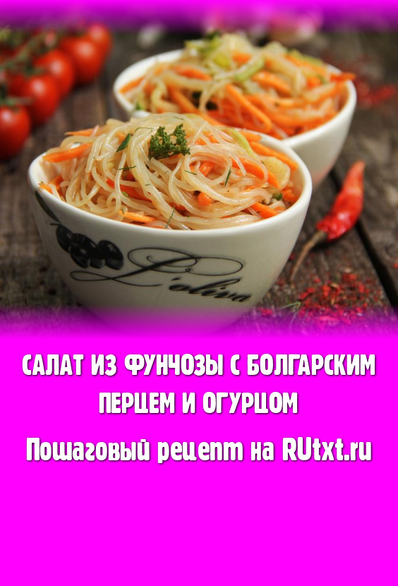 Вкусный, в меру острый, яркий салат, приготовленный из фунчозы с добавлением болгарского перца и огурца, подать к столу.