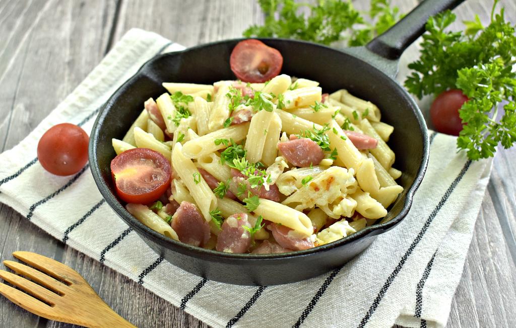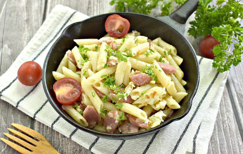 Предлагаю очень простой рецепт приготовления на сковороде сытного, вкусного и аппетитного блюда - макарон с сосисками и яйцом. Макаронные изделия можно взять любой формы (у меня - перья). Сосиски тоже подойдут любые, главное, чтобы они были качественные. Приготовьте это простое блюдо и оно, наверняка, придётся вам по вкусу! Расчёт ингредиентов дан на 2 порции.