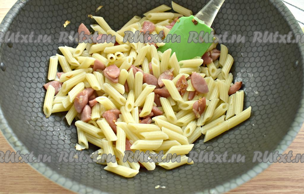 Перекладываем отварные макароны на сковороду к сосискам и луку, перемешиваем.