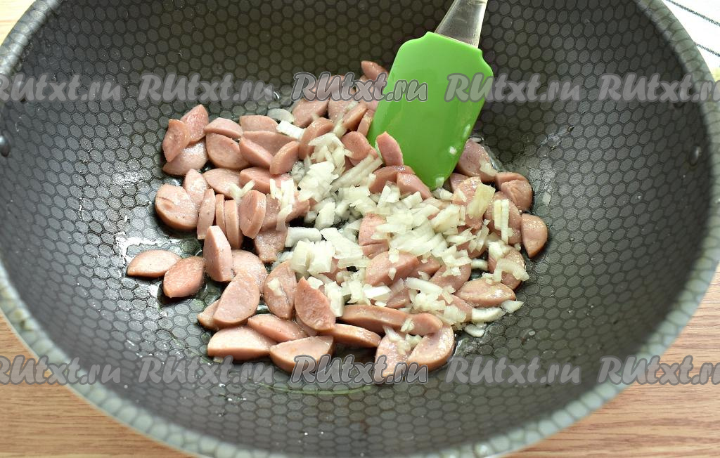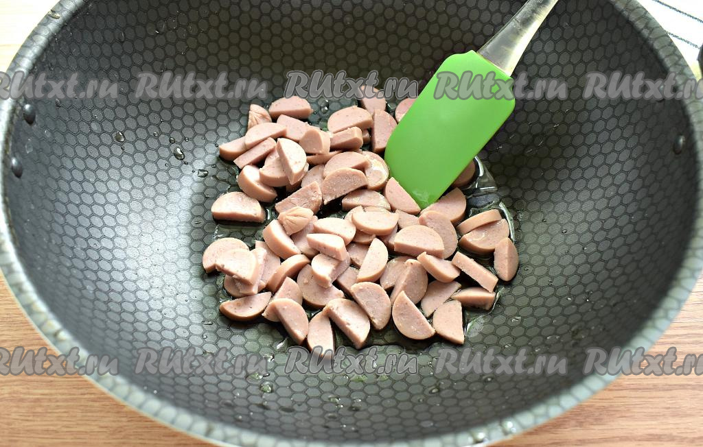 Разогреваем в сковороде растительное масло, затем выкладываем нарезанные сосиски, обжариваем их на среднем огне 2-3 минуты, помешивая.