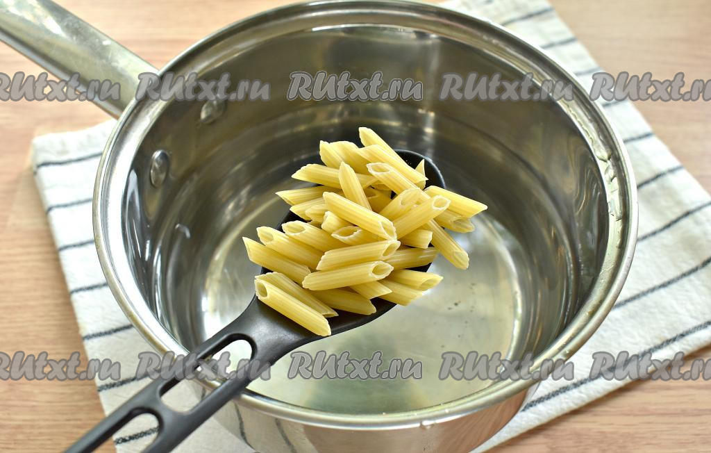 В кастрюлю наливаем, примерно, один литр воды, по вкусу её солим и ставим на огонь. После закипания воды выкладываем в неё макаронные изделия и сразу перемешиваем. Когда вода снова закипит, уменьшив огонь, варим макароны в течение времени, указанного на упаковке (обычно на это требуется от 7 до 9 минут).