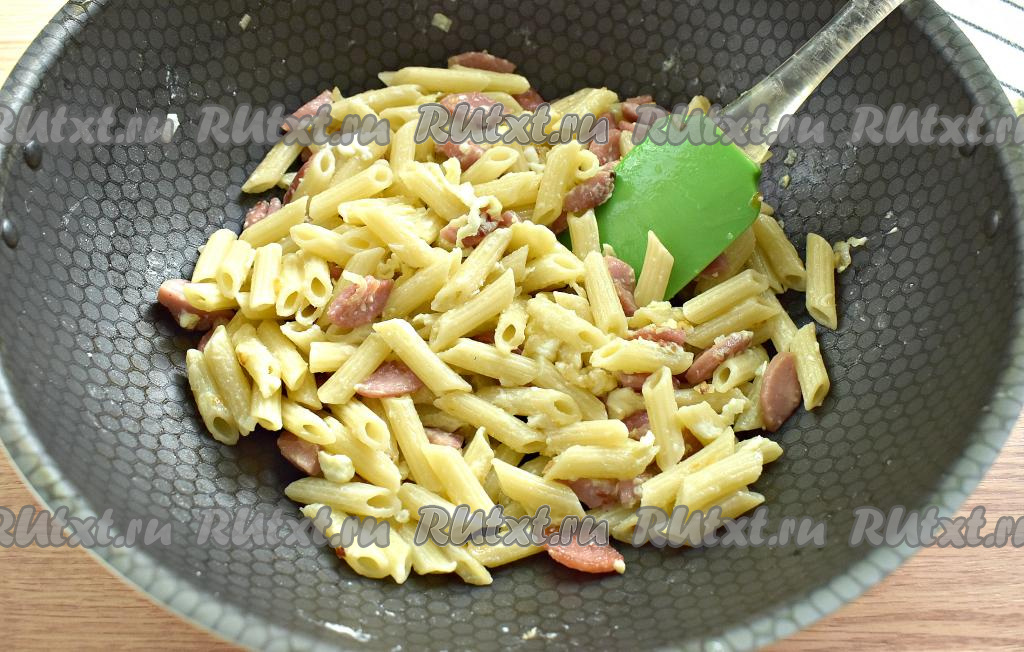 В сковороду с макаронами и сосисками разбиваем яйцо.