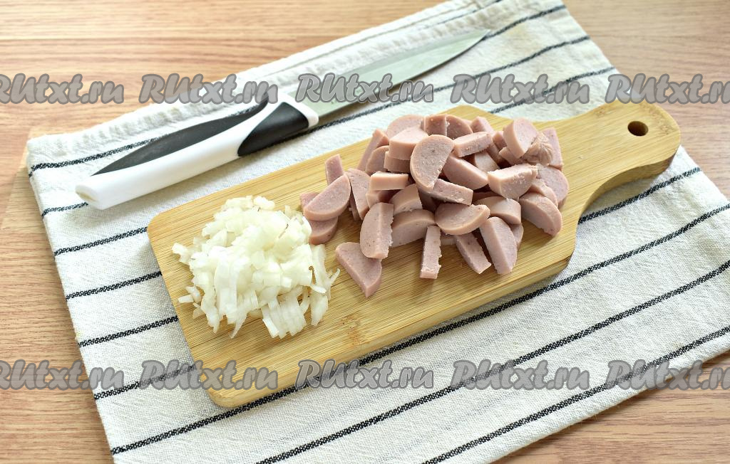 Сосиски, очищенные от слюды, нарезаем на полукружочки. Половину очищенной луковицы мелко нарезаем.