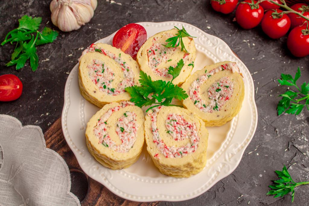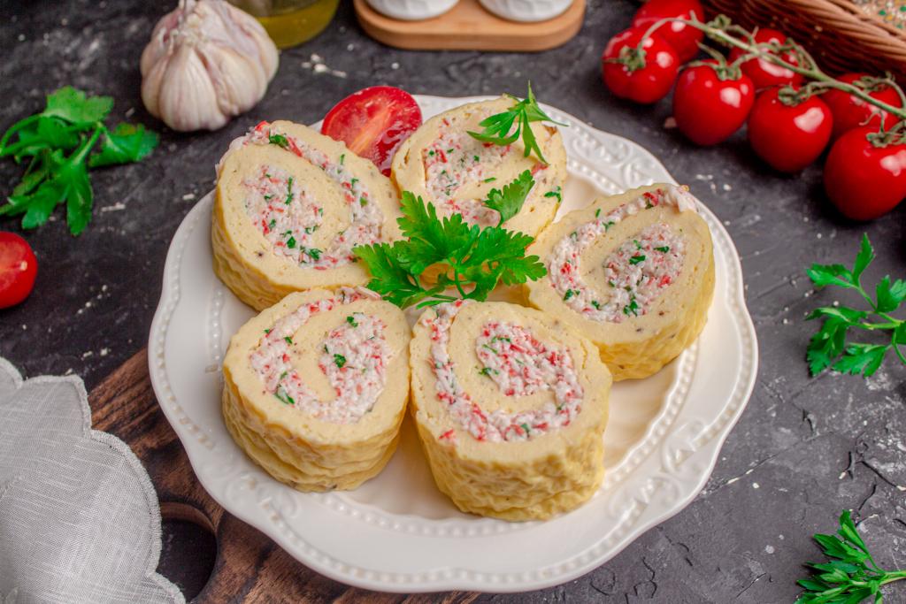 Сегодня готовим красивую и вкусную закуску - яичные рулетики с крабовыми палочками и сыром. Это яркое блюдо украсит и повседневный, и праздничный стол. Сделать такую закуску очень просто, а в итоге мы получаем нежнейший рулет с очень вкусной яичной основой и аппетитной начинкой из сыра, зелени и крабовых палочек.