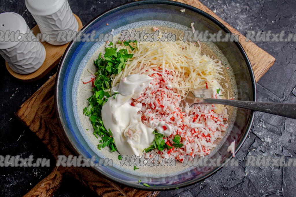 К получившей крабовой-сырной смеси добавьте майонез, хорошо перемешайте начинку.