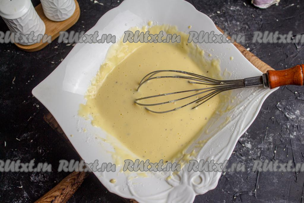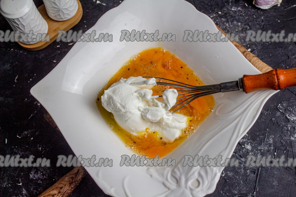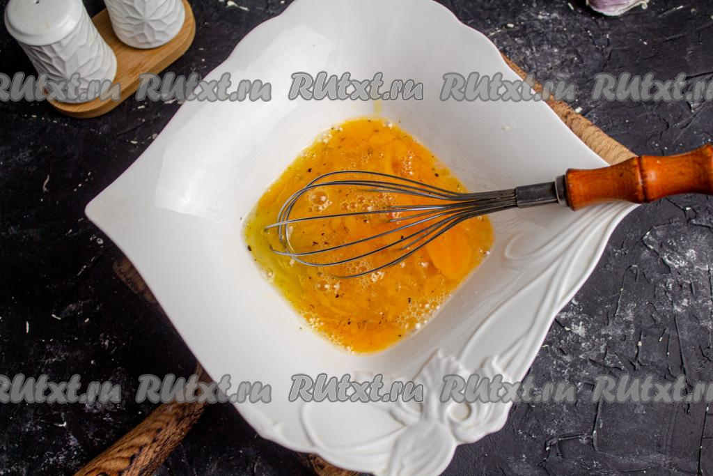 Вначале приготовим омлет, для этого в подходящую посуду вбейте куриные яйца и взбейте их венчиком. Посолите яичную смесь и поперчите по вкусу.