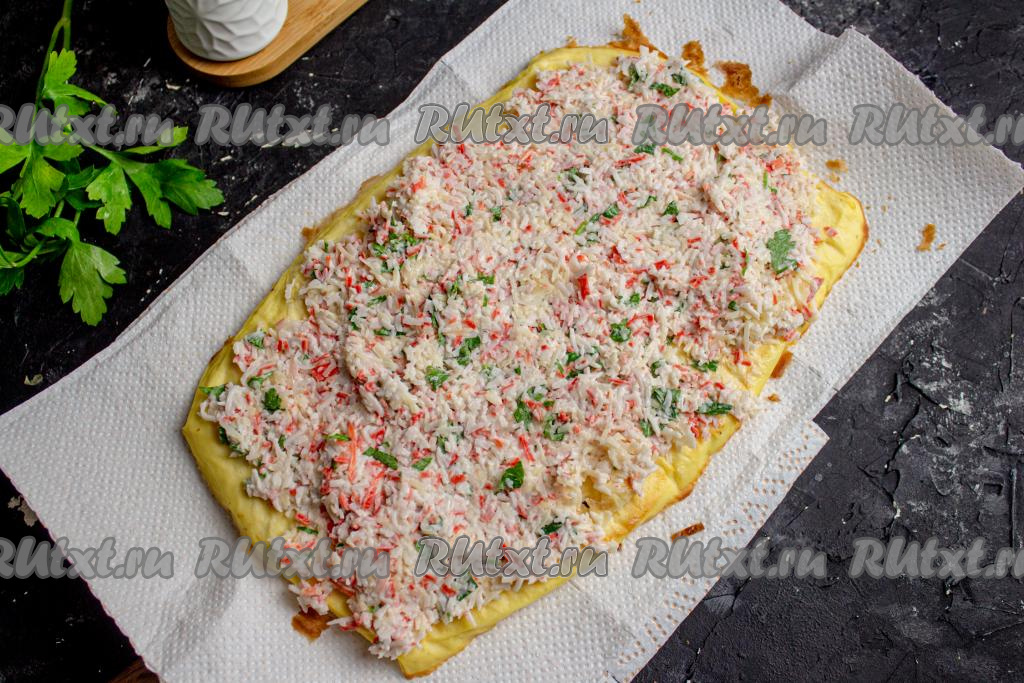 Крабовые палочки, если они заморожены, немного разморозьте. Для приготовления начинки на тёрке натрите сыр и не полностью размороженные крабовые палочки, добавьте мелко нарезанную зелень и измельчённый чеснок.
