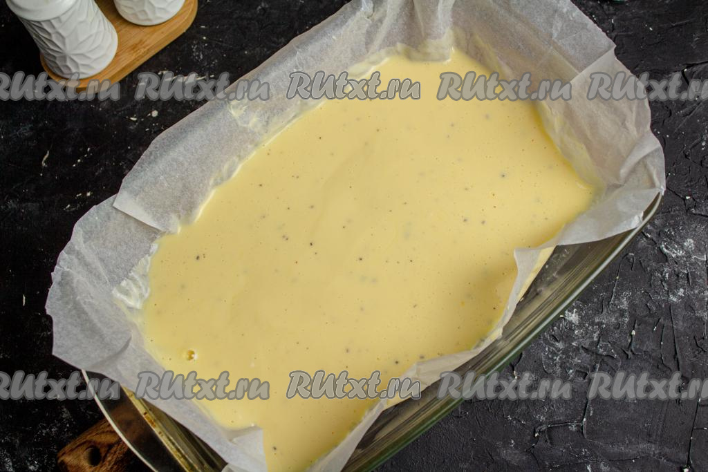 Яично-сметанную смесь вылейте в форму для выпечки, застеленную пергаментом. Я использовала форму размером 17 сантиметров на 30 сантиметров, если желаете, чтобы омлет был тоньше, то возьмите форму побольше. Обратите внимание на пергамент, желательно, чтобы в его составе был силикон (об этом обычно написано на упаковке) или перед выкладыванием яично-сметанной смеси смажьте пергамент растительным маслом, чтобы готовый омлет легко отделился от бумаги.