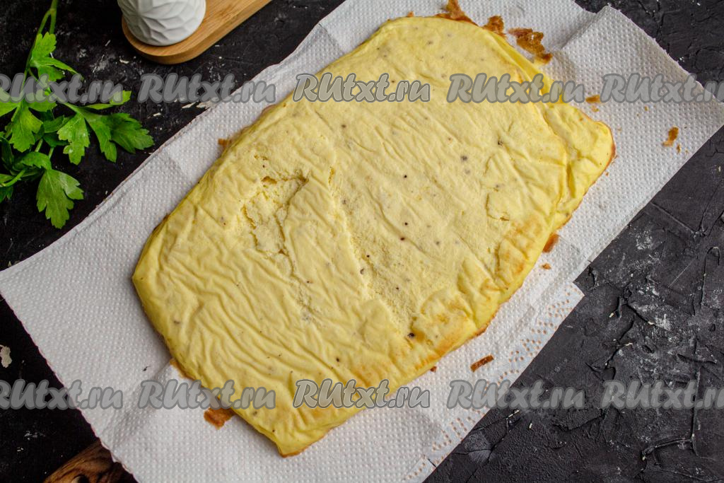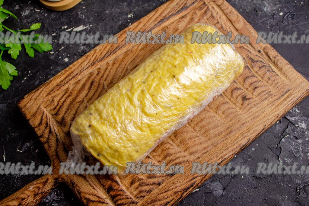 Начиная с узкого края, сверните омлет с начинкой в рулет. Яичный рулет заверните в пищевую плёнку и уберите на 1-2 часа в холодильник.