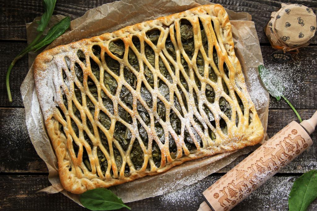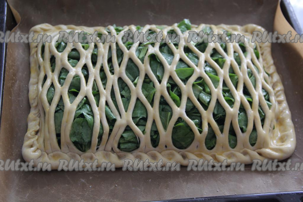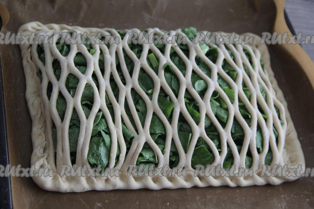 Растянуть решётку и выложить поверх щавеля. Скрепить два пласта теста с помощью защипов.