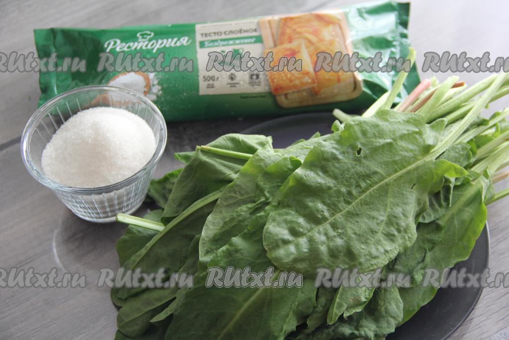 Смазать верх пирога взбитым желтком и поставить в разогретую духовку. Выпекать пирог с щавелем в разогретой духовке минут 25-30 при температуре 180 градусов (до золотистого цвета слоёного бездрожжевого теста).
