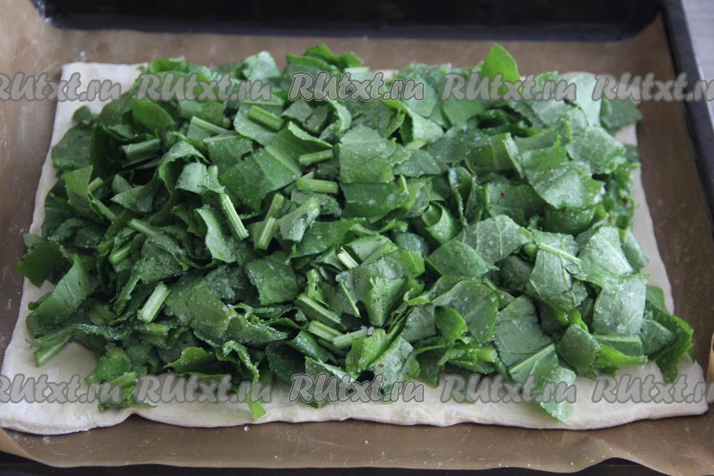 Выложить щавель пышной шапкой на тесто, немного отступив от краёв.