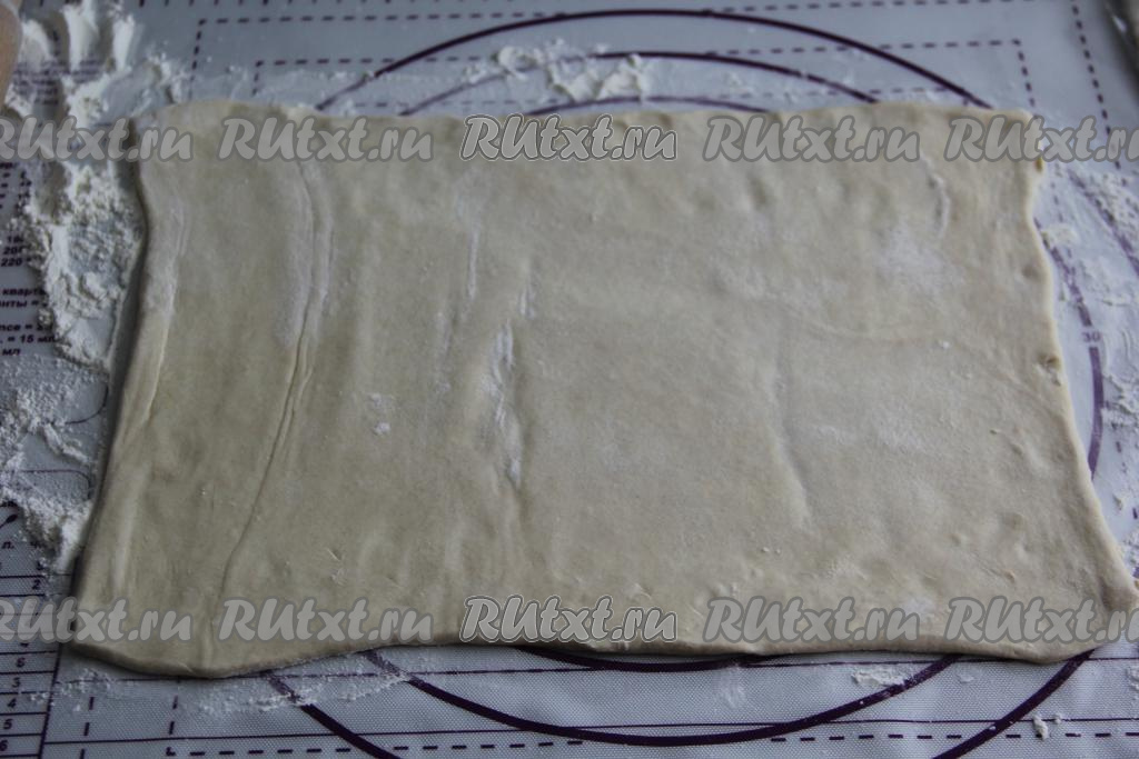 Слоёное тесто разморозить при комнатной температуре. Я разделила тесто на две части. Одну часть теста сделала побольше, она стала основой пирога. На присыпанной мукой поверхности большую часть слоёного теста слегка раскатать в пласт и переложить на противень, застеленный пергаментом.
