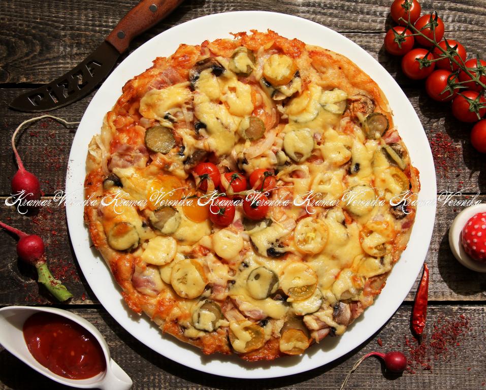 Сегодня предлагаю испечь вкусную, аппетитную пиццу на жидком дрожжевом тесте. Рецепт несложный. Дрожжевое тесто замешивается очень просто, даже руками его вымешивать не нужно. Основа пиццы из такого теста получается вкусной, воздушной и мягкой. Начинку можно положить любую, какую вы пожелаете. Я сделала из грибов, бекона, свежих помидоров, маринованных огурцов, лука и сыра. Уверена, такая пицца многим придётся по вкусу!