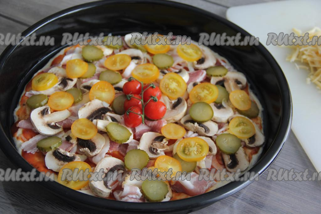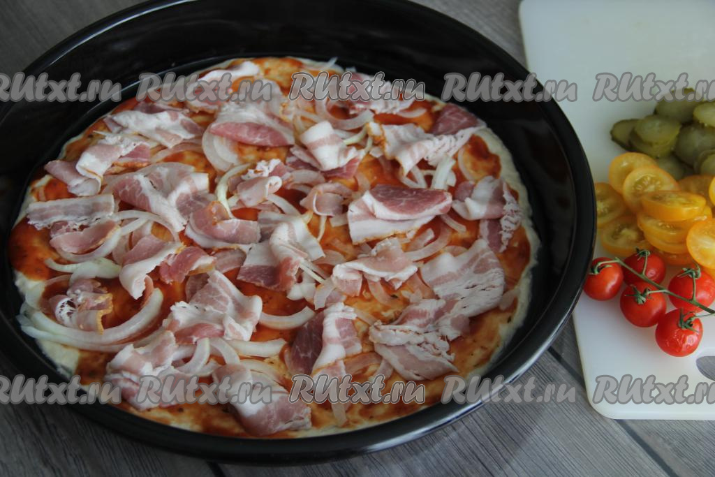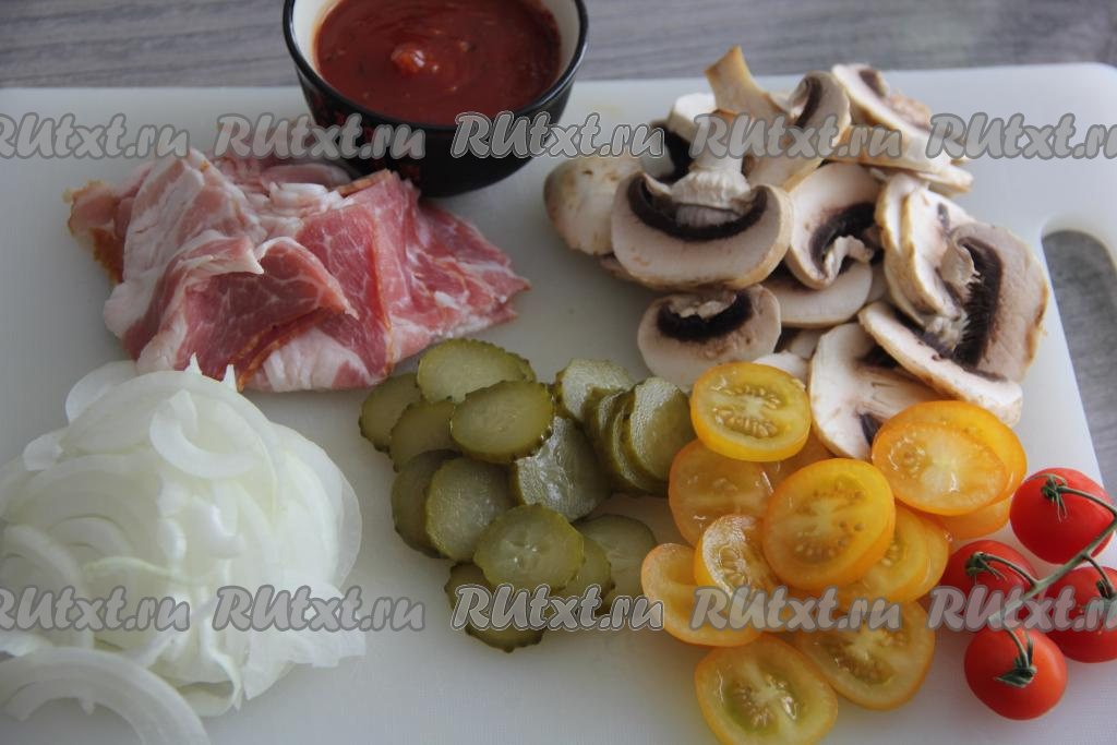Подготовить начинку для пиццы, для этого очищенный лук нужно нарезать на тонкие полукольца. Вымытые помидоры нарезать на кружочки (помидоры черри можно просто разрезать пополам). Бекон (или любые колбасные изделия) нарезать на тонкие кусочки. Шампиньоны промыть, обсушить и нарезать их на пластины. Огурчик нарезать на кружочки.