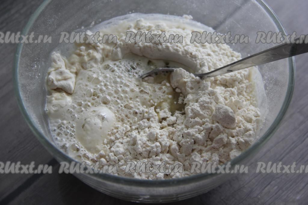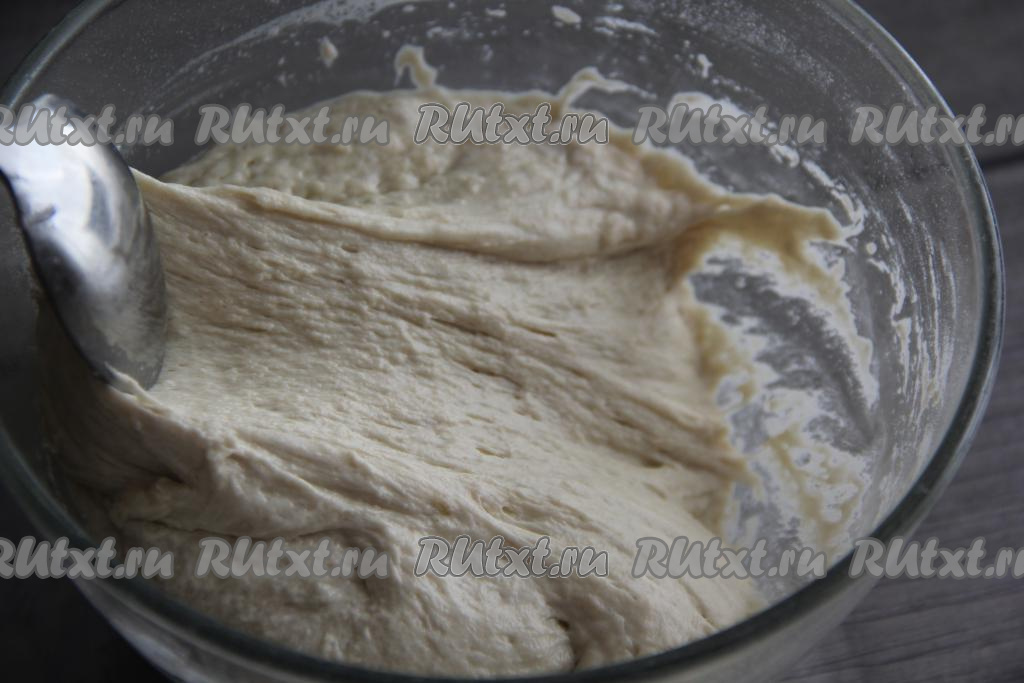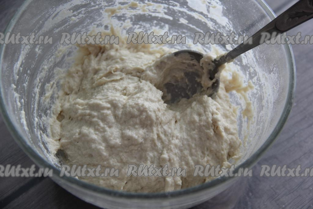 Перемешать тесто для пиццы ложкой. Оно получится не густым, липким и тягучим. Вымешивать руками его не нужно, замес делается только ложкой.