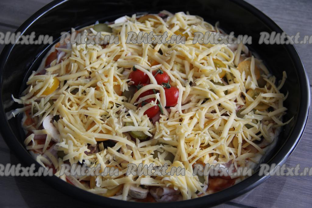 Пиццу посыпать натёртым сыром и поставить её в хорошо прогретую духовку.