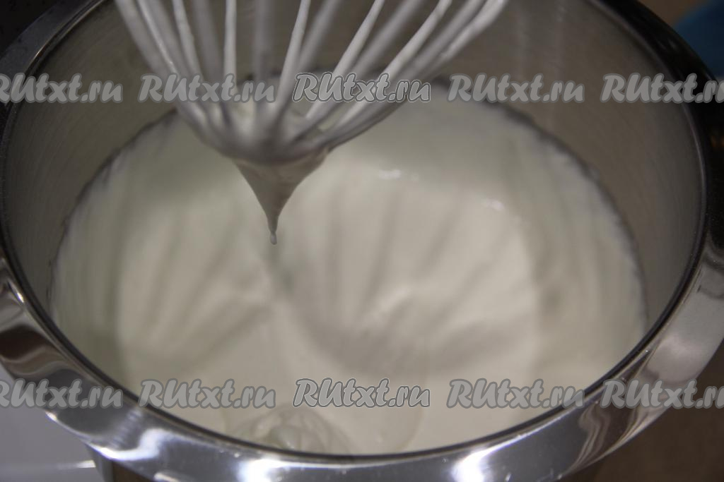 Для приготовления крема охлаждённые сливки взбить миксером с сахарной пудрой до мягких пиков.