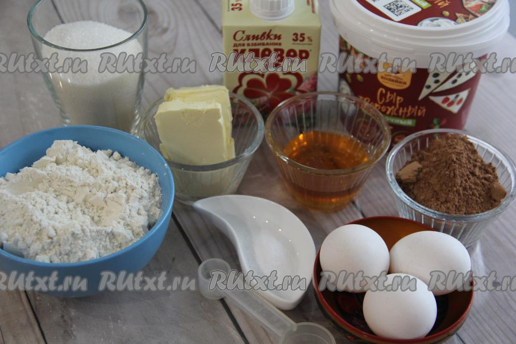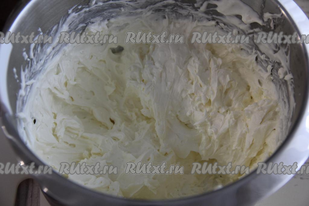 Продолжая взбивать, добавить в сливки творожный сыр. Взбить творожно-сливочный крем до стойких пиков.
