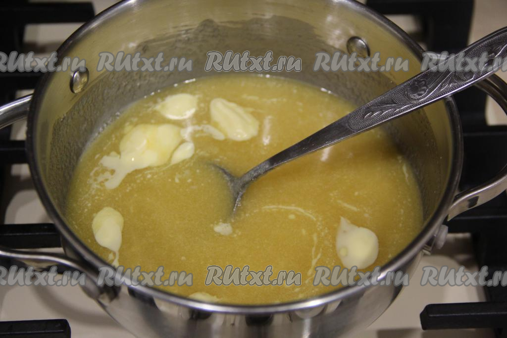 На среднем огне, при помешивании, довести массу до полного растворения масла и сахара.