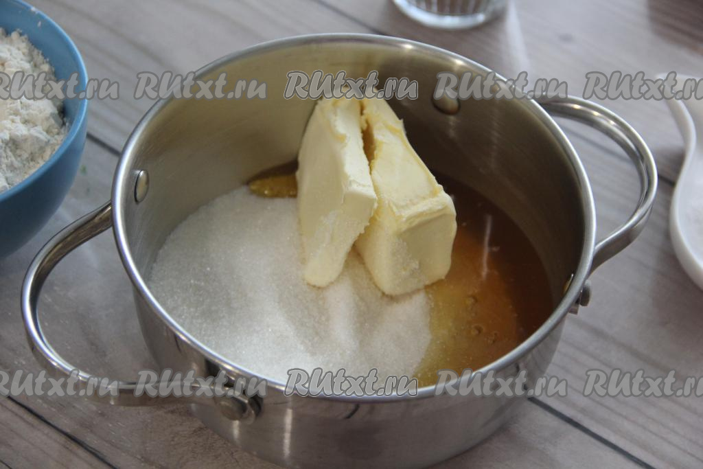В сотейнике (или кастрюле) соединить сахар, сливочное масло и мёд, поставить на огонь.
