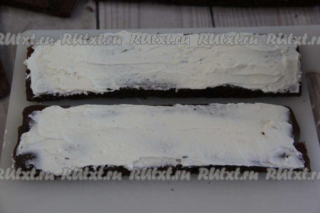 Края у коржей срезать и оставить обрезки для обсыпки торта. Разрезать каждый корж на три части. Каждую такую полоску смазать творожно-сливочным кремом.