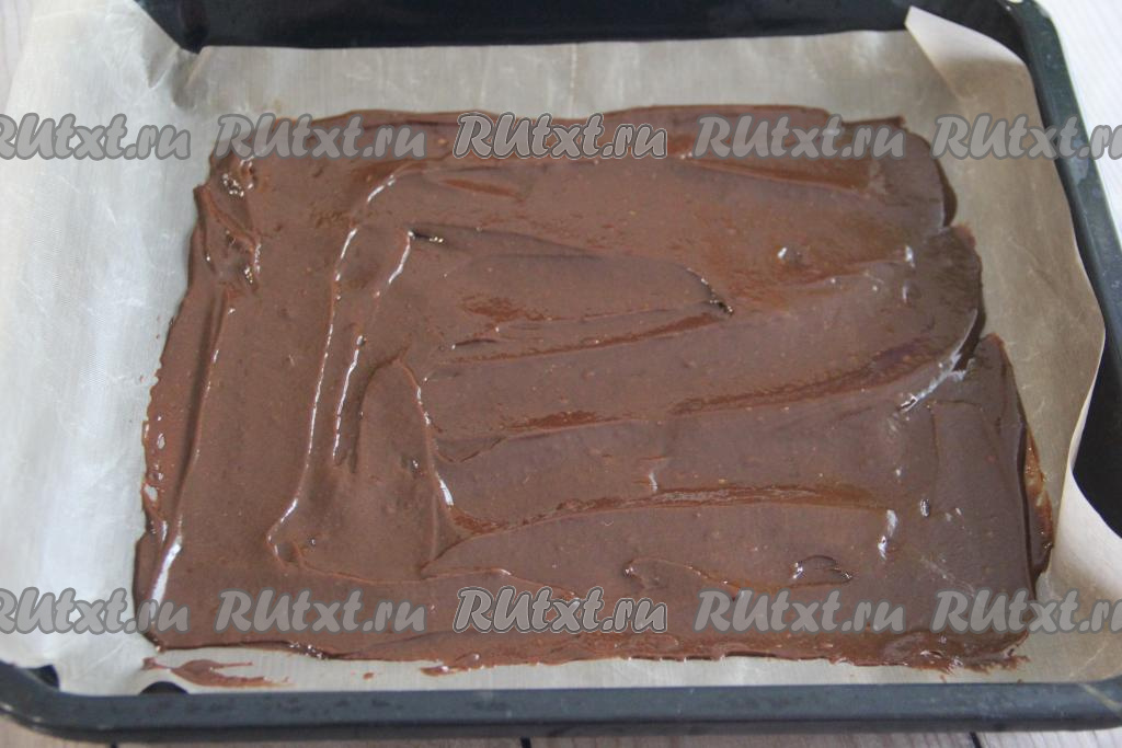 Разделить тесто на 3 равные части, я для этого использовала весы. Каждую часть выложить на противень (я использовала противень размером 30 сантиметров на 30 сантиметров), застеленный пергаментом (или ковриком для выпекания). Разровнять тесто в тонкий пласт.
