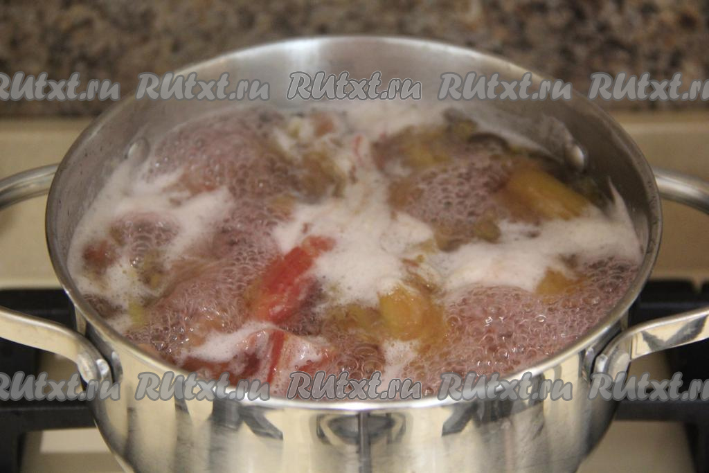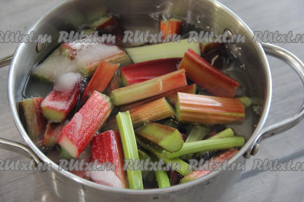 В кастрюлю выложить брусочки ревеня. Добавить сахар и 500 миллилитров воды. Поставить кастрюлю на огонь.