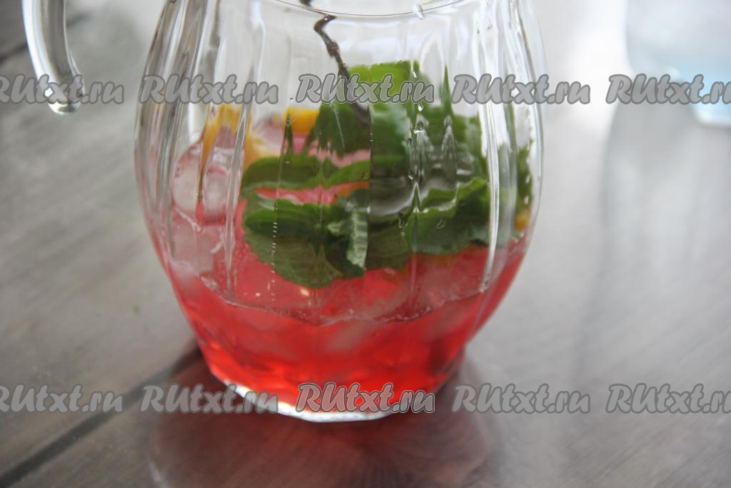 Веточки мяты и лимон вымыть. Я подавала лимонад с ревенем в 1,5-литровом графине, поэтому использовала только четверть лимона, веточку мяты, 200 миллилитров сиропа из ревеня и 1 литр газированной воды. Из оставшегося сиропа и ингредиентов я сделала лимонад после того, как была выпита первая порция напитка. Но, конечно, можно сделать сразу лимонад из всего сиропа и двух литров газированной воды. Итак, в 1,5-литровый графин (или другую удобную ёмкость) всыпать кусочки льда.