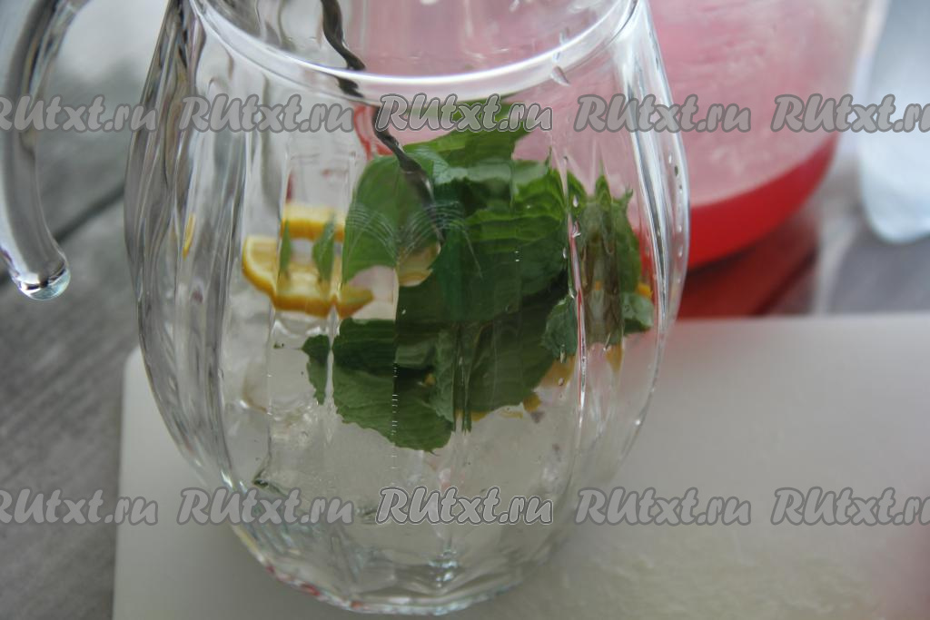 1/4 лимона нарезать на полукружочки, добавить в графин вместе с листочками мяты.